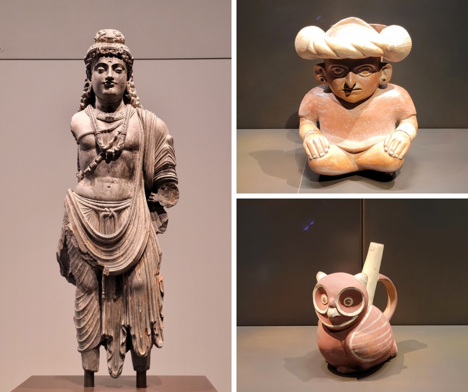 Phải, trên: Lọ gốm sứ trong hình dạng người đàn ông ngồi tư thế khoanh chân, nền văn minh Mochica, Peru, 100-700 CN